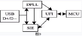 AT89C5131的USB2.0全速从接口的结构如图3所示,其包括USB D+/D-的接口缓冲,数字锁相环,串行接口引擎(SIE)和通用功能接口(UFI)。其中数字锁相环以单片机的时钟为输入,产生了USB接口其他部分所需的48MHz时钟。串行接口引擎完成USB通信物理层NRZI码的编码与解码,CRC生成以及校验与纠错。通用功能接口包含了一个双端口的数据存储器,其一端与串行接口引擎链接,另一端通过数据总线与单片机相连接,使单片机可以通过特殊功能寄存器完成对USB2.0从接口的控制与通信。