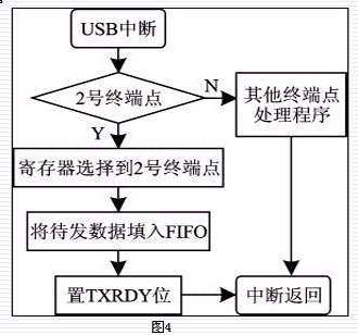 由于各个终端点的行为相对独立,对于每个终端点的控制过程又有相似性,在这里以2号终端点即作为数据接口的IN终端点为例,说明软件是如何对终端点进行操作和控制的,其控制流程图如图4所示。2号终端点是一个IN的终端点,它的主要工作是模拟物理串口的TXD线,向主设备发送数据。当主设备发出IN的请求时,如果FIFO不空,就向主设备发送FIFO的内容;如果FIFO为空,则向主设备发送一个空包作为回应。AT89C5131在收到IN的请求时,会触发USB中断(如果被使能),在中断处理程序中,如图4所示,首先判断中断的触发源是哪个终端点,如果是2号终端点,将USB寄存器组映射到2号终端点的那一组,然后将需要发送的串口数据填入FIFO寄存器(UEPDATX),置位UEPSTAX的TXRDY位,表示FIFO中的数据已经准备好,这时USB接口就会自动响应IN请求,并将FIFO中的数据发送出去,程序则可退出中断服务程序。对于其他的终端点,其处理过程也是相似的。