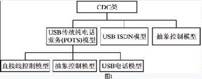 USB的CDC类是USB通信设备类(Communication Device Class)的简称。CDC类是USB组织定义的一类专门给各种通信设备(电信通信设备和中速网络通信设备)使用的USB子类。根据CDC类所针对通信设备的不同,CDC类又被分成以下不同的模型:USB传统纯电话业务(POTS)模型,USB ISDN模型和USB网络模型。其中,USB传统纯电话业务模型,有可分为直接线控制模型(Direct Line Control Model)、抽象控制模型(Abstract Control Model)和USB电话模型(USB Telephone Model),如图1所示。本文所讨论的虚拟串口就属于USB传统纯电话业务模型下的抽象控制模型。