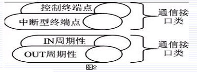 通常一个CDC类又由两个接口子类组成通信接口类(Communication Interface Class)和数据接口类(Data Interface Class)。笔者主要通过通信接口类对设备进行管理和控制,而通过数据接口类传送数据。这两个接口子类占有不同数量和类型的终端点(Endpoints),如图2所示。
